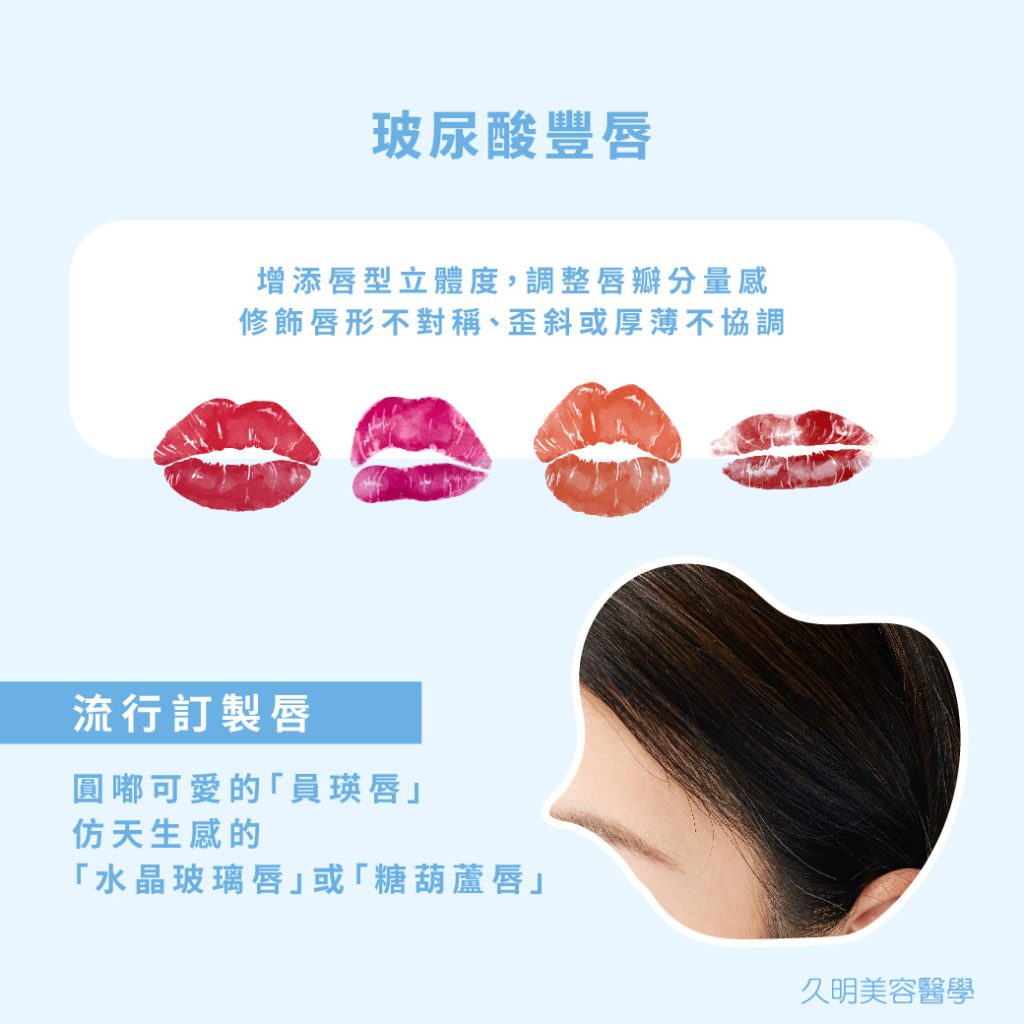 隨著「玻尿酸」施打於嘴唇的不同位置或不同的劑量、手法,不僅能增添唇型立體度、調整唇瓣的分量感,也可以改變唇形;例如原生唇形不對稱、有點歪斜、或唇型厚薄度較不協調等等,都可以美化修飾。
