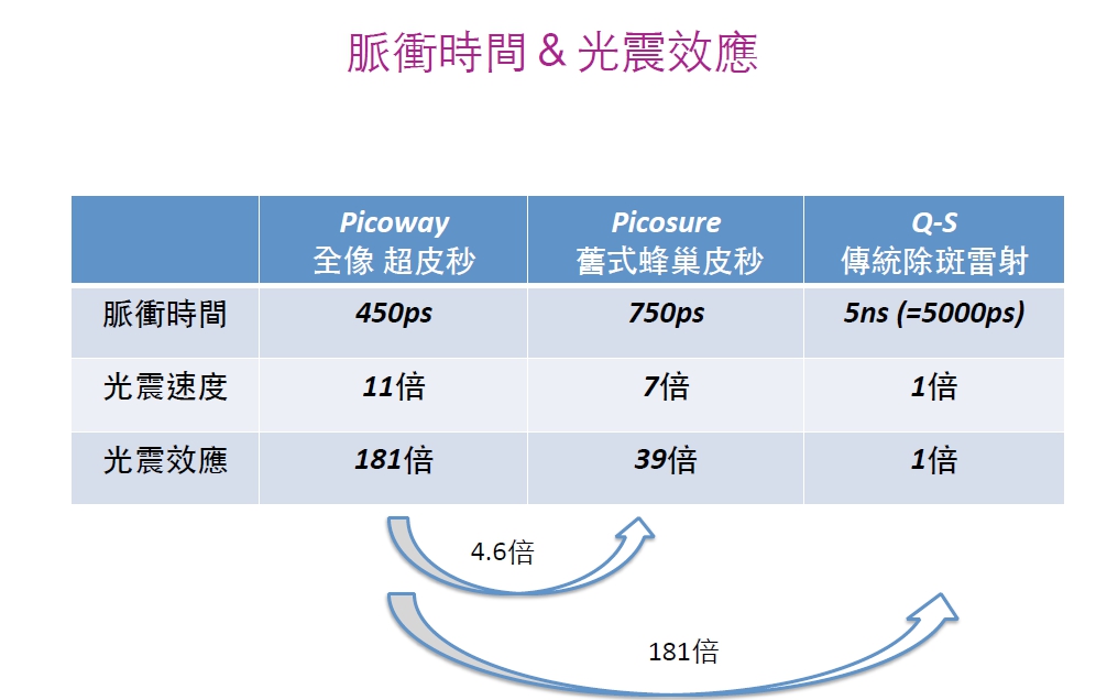 傳統使用加熱原理的雷射是「奈秒」,1奈秒等於「0.0000000001秒」,而1皮秒等於「0.0000000000001秒」,所以皮秒就是凡間世界的「1秒的10兆分之一」如此短少的時間喲~~~這麼短時間內送出脈衝能量,不像傳統的雷射是籍由熱能治療,皮膚組織從此免於熱偒害造成的傷口