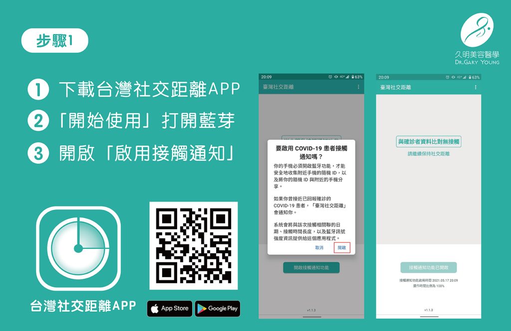 1.開啟APP→點選「開始使用」+打開藍芽2.跳出「啟用接觸通知」→點選「開啟」3.再出示「接觸比對畫面」予診所人員