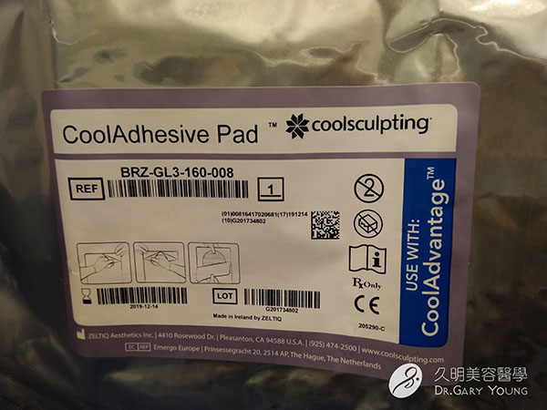 到了療程的這天,由美容師協助醫生,以「coolsculpting」原廠的專用板子(有的方形有的橢圓形)局部標記,鎖定要做負壓吸引的範圍,接著拆封同樣印有「coolsculpting」原廠標示的「防凍凝膠片」,這層充滿科技感像果凍面膜一樣的凝膠片,可以為皮膚阻隔低溫剌激,防止皮膚組織被凍傷,太貼心與專業的設計了吧!