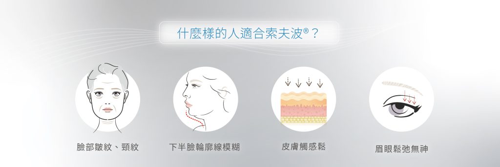 索夫波可治療的部位包含:左右臉部、蘋果肌的位置、下巴、眉尾 ( 近眼周區域 )、額頭、頸部(靠近雙下巴的位置)。