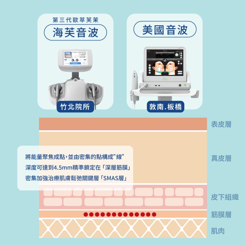 美國音波及海芙音波,都是將溫度在 65℃~70℃ 的聚焦超音波凝結於 SMAS 筋膜層,重點加強筋膜層收縮緊緻、連帶拉緊周圍組織;當”聚焦型音波”搭配 ”容積式加熱音波”「索夫波」時,即可呈現非常強大且驚艷的緊膚除皺成果。